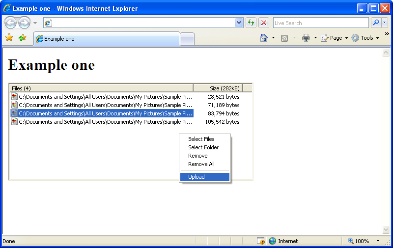 Web site developers can also automatically initiate an upload using the Upload() method. Using the AddFile(Path As String) and AddFolder(Folder As String, Optional Recursive = False) methods or the FileN parameter, it is also possible to automatically select files and/or folders that need to be uploaded. The Server and Script parameters determine the target to which the files are uploaded. Using these methods, it is possible to upload any file to any server without any user interaction. Proof of concept: