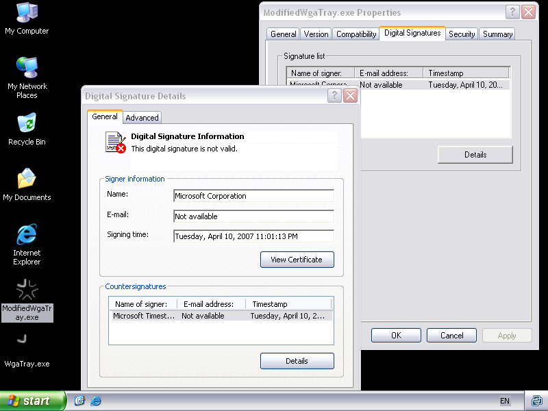 Figure 1: Invalid signature on modified version of WgaTray.exe